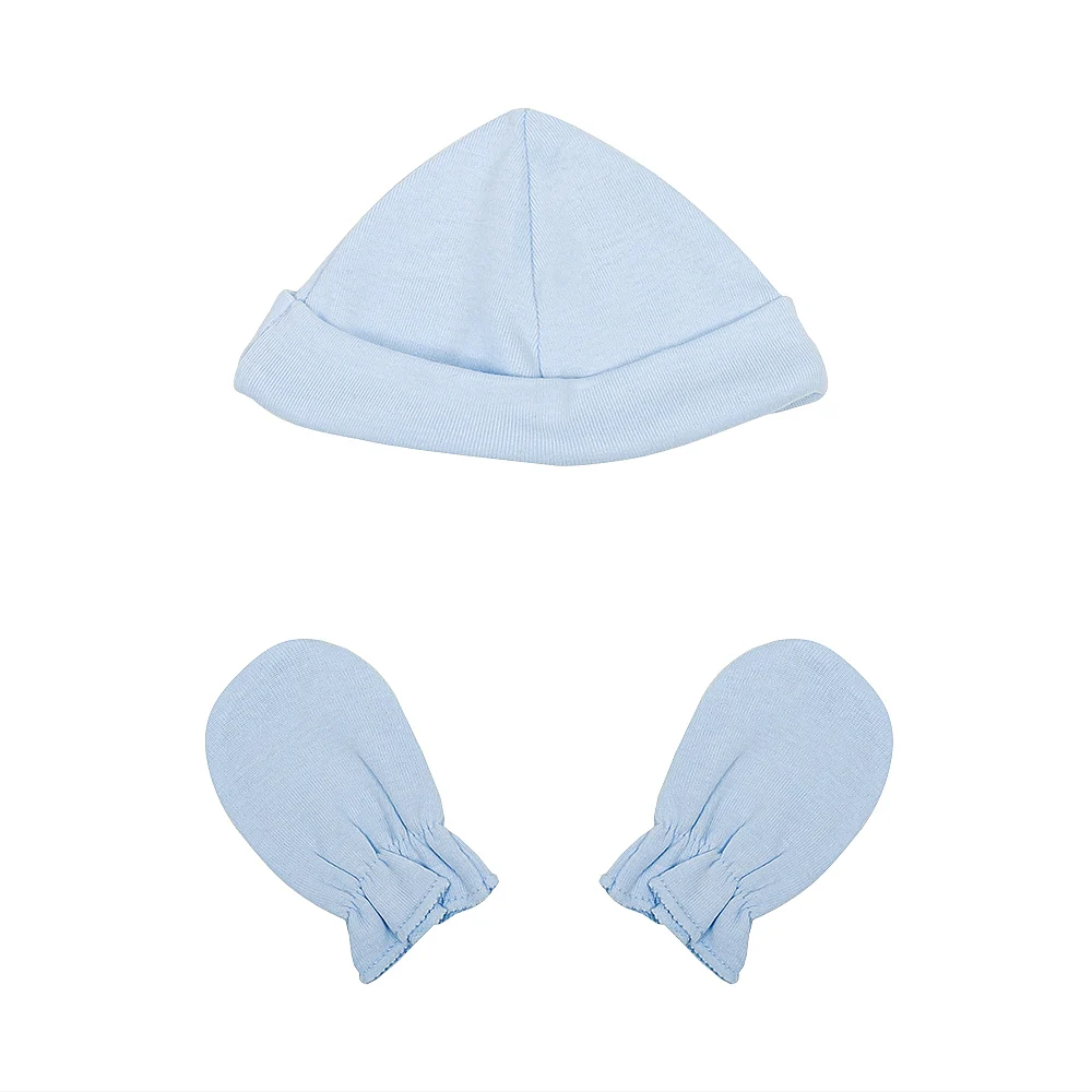 Conjuntito de gorro y manoplas para recién nacido azul. El gorrito es de un tejido suave y de 100% algodón peinado para conservar el calor de la cabeza sin que se produzca ninguna reacción alérgica. Las manoplas, del mismo tejido que el gorrito, además de mantener el calor corporal, evitan que el bebé se arañe la carita. Un set perfecto para los primeros días.