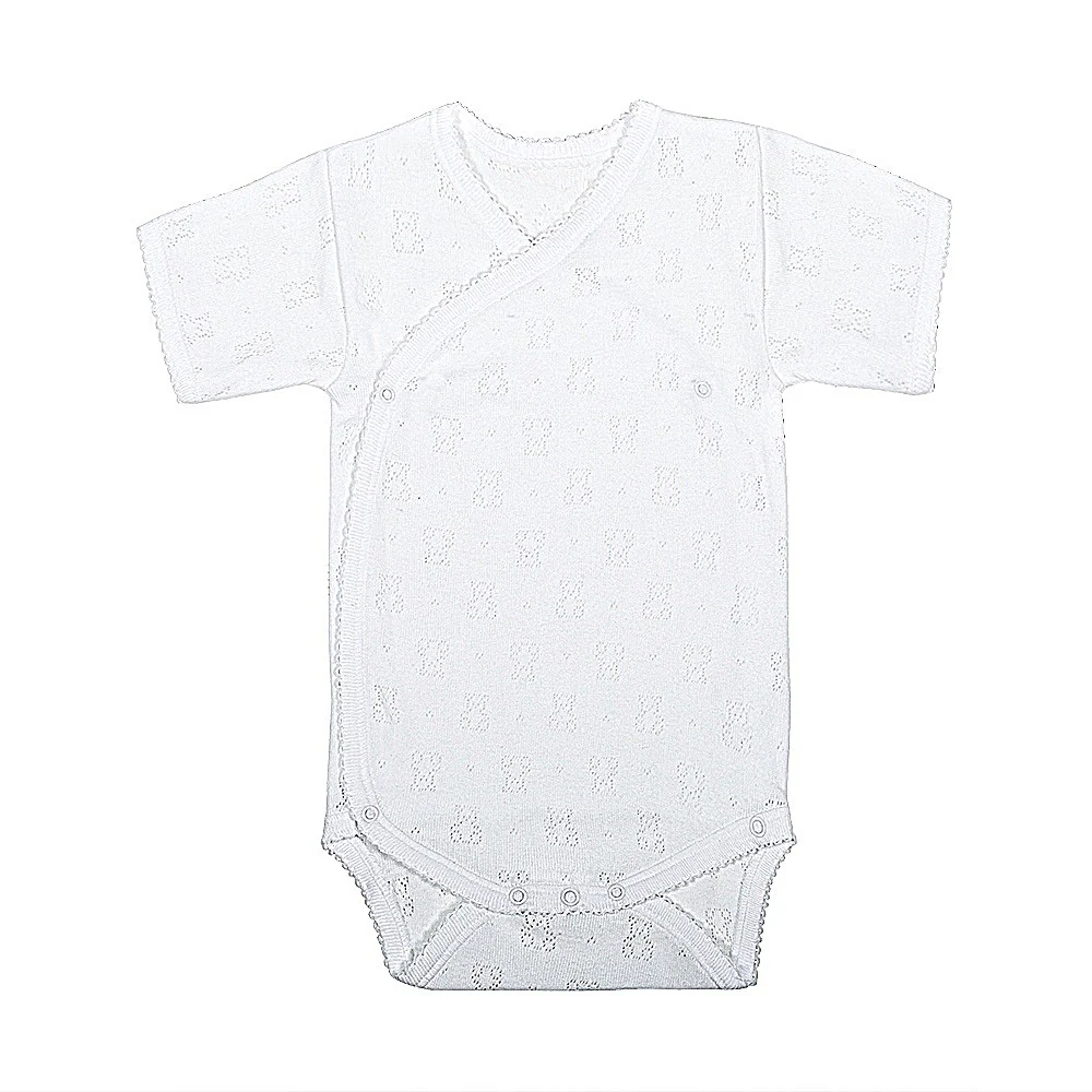 Body de manga corta y tejido de todo tiempo. Se abre totalmente por la parte delantera y por las piernas mediante unos corchetes súper resistentes. Este sistema es muy cómodo para vestir y desvestir a tu bebé sin moverlo mucho. Con una puntilla que no pica de adorno y hecho de un tejido que aguanta innumerables lavados. Tiene un calado en forma de ositos que, además de ser muy bonito, ayuda a una mayor transpiración para los días más calurosos.