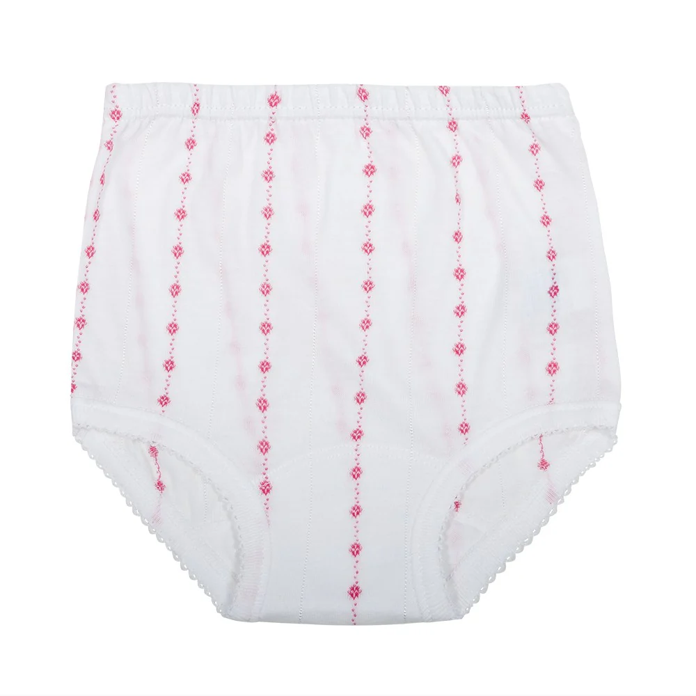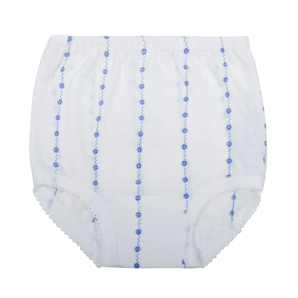 Braguita para los bebés más pequeños y también para los más mayores. Puede usarse con o sin pañal. La forma de las perneras se adapta a los muslitos del bebé sin apretarlos. La puntilla de las perneras no pica y da un toque especial. Tiene además un bordado en forma de puntitos y líneas que no decolora con los lavados. Está fabricada con 100% algodón extra suave para cuidar su piel. La cintura no aprieta.