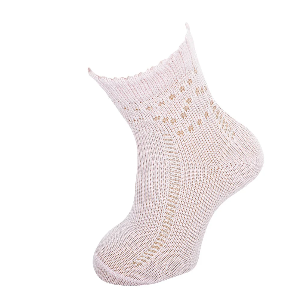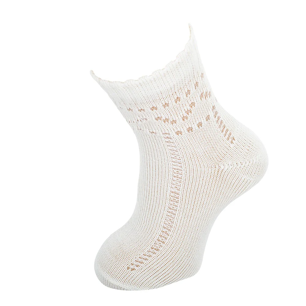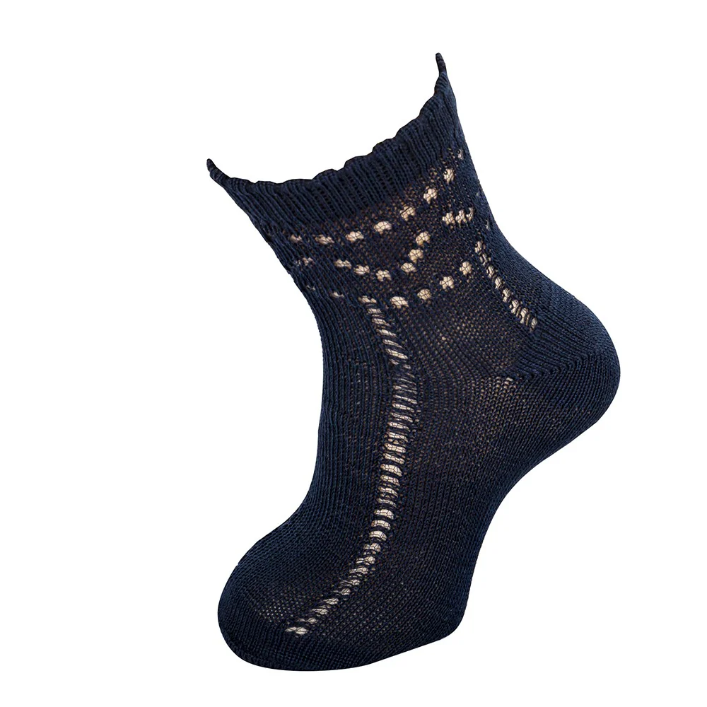 Calcetín con alta composición de hilo de Escocia, altamente transpirable y resistente. Con un elegante calado y puño de fantasía en forma de ondas, que lo hace perfecto para ocasiones especiales como ceremonias o eventos. Su altura es por los tobillos, con un puño que no aprieta. El talón y la puntera están reforzados para un mayor uso y el tejido no hace bolas ni decolora con los lavados.