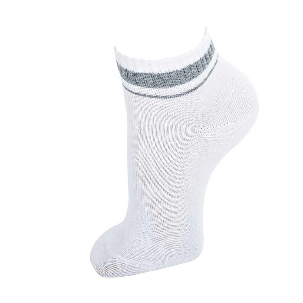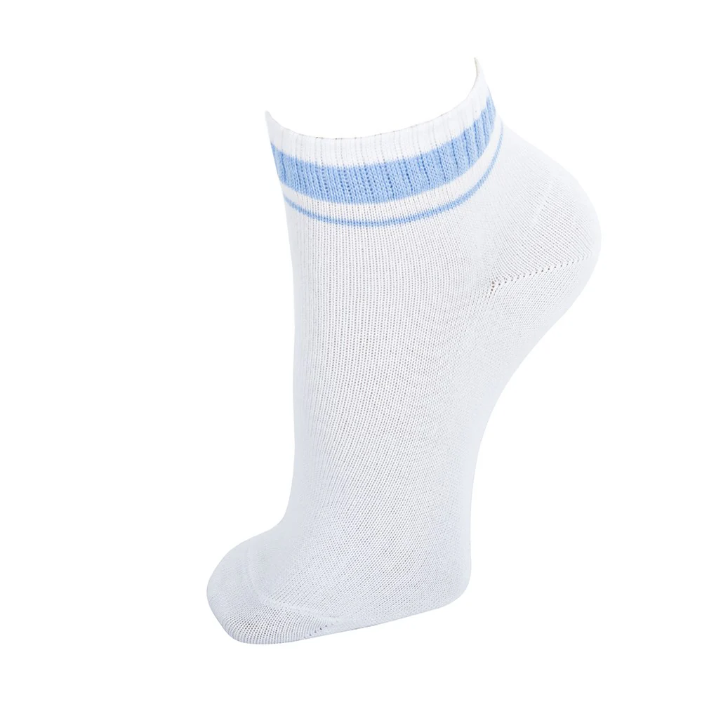 Calcetín tobillero con alta composición en algodón peinado, muy transpirable. Blanco y con rayas en el tobillo de diferentes colores. Las punteras y talones están reforzados puesto que es una zona de mayor desgaste. Las costuras, que son planas, quedan por encima de los dedos sin molestar, y el puño sujeta sin apretar. El tejido no hace bolas y no se estropea con los lavados. Es de un tejido de todo tiempo, concebido tanto para actividades deportivas, como diarias.