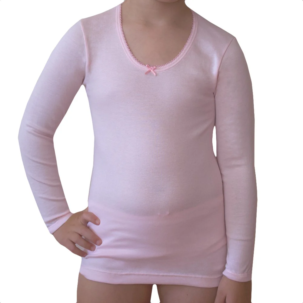Camiseta interior de manga larga con alta composición en algodón peinado, altamente transpirable, en color rosa. Su porcentaje en elastano y la forma del tejido, hace que sea una prenda adaptable a todo el cuerpo y que recupere su forma tras todos los lavados. Además es sin costuras, por lo que no marca por ningún lado. Con una puntilla en el cuello en forma de ondas que no pica. El bajo, el cuello y los puños no se deforman con el tiempo. También tiene de adorno un aplique en forma de lacito en el cuello. El tejido es anti-pilling, no hace bolas. Combina con 5525R 5825R y 5821R