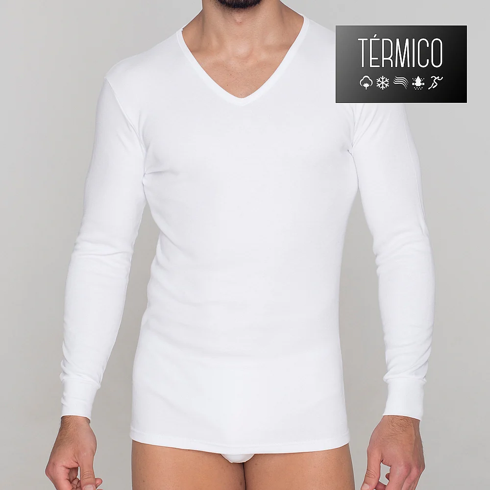 Camiseta interior de manga larga y cuello pico con tejido térmico afelpado de invierno. No se ve debajo de prendas exteriores. Gracias a su composición de 100% algodón peinado, totalmente natural y transpirable, calienta sin retener la humedad, y se aconseja para las personas con problemas de alergia o piel atópica. No tiene costuras, por lo que no roza la piel por ningún sitio y las terminaciones son todas extra-planas y resistentes. Además el cuello y los puños están hechos de un tejido especial adaptable, que no se deforma con el uso. Tejido anti-pilling, que no hace bolas. Calidad premium.
