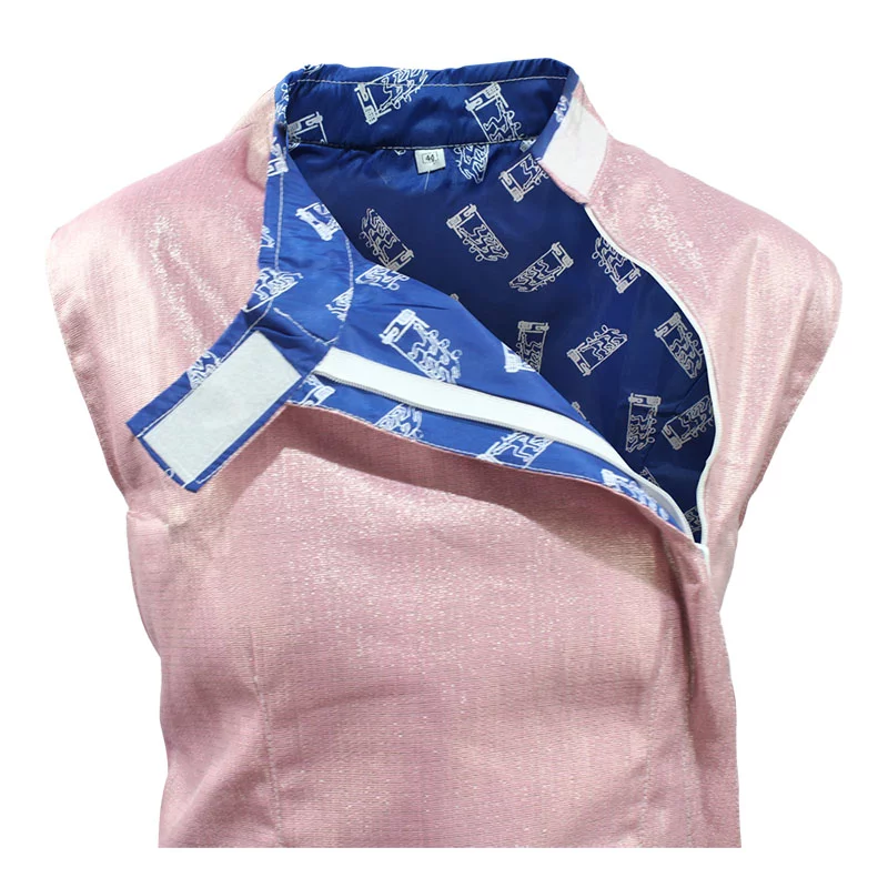 Confeccionado en tela laminada y tejido en hilo de niquel (45%) de alta densidad, material inoxidable. Aspecto brillante. Forro de tela especial impermeable. Modelo Inoxidable de larga duración (Agua a 30 °C, lavado en seco). Recomendado para entrenamientos y competencias de esgrima.
