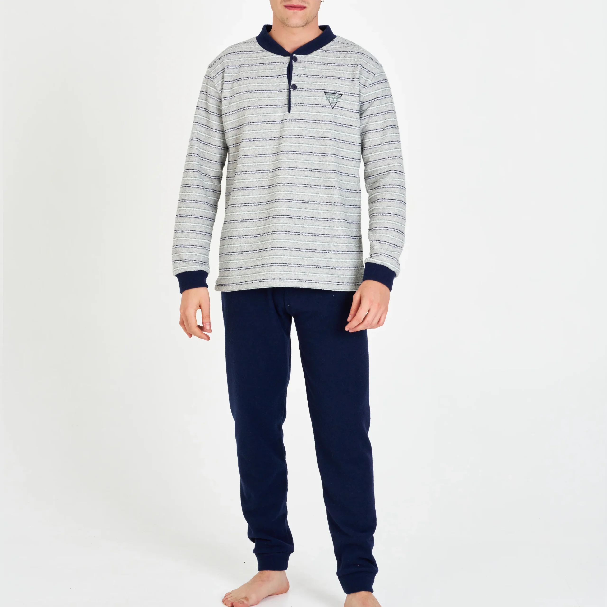Pijama de invierno en tejido de rizo cálido y suave. Camiseta gris a rayas con cuello tipo polo y tapeta de botones en contraste marino, puños de canalé y detalle bordado. Pantalón liso azul marino con cintura elástica y puño en el bajo para mejor ajuste. Confort térmico y tacto esponjoso para las noches más frías.