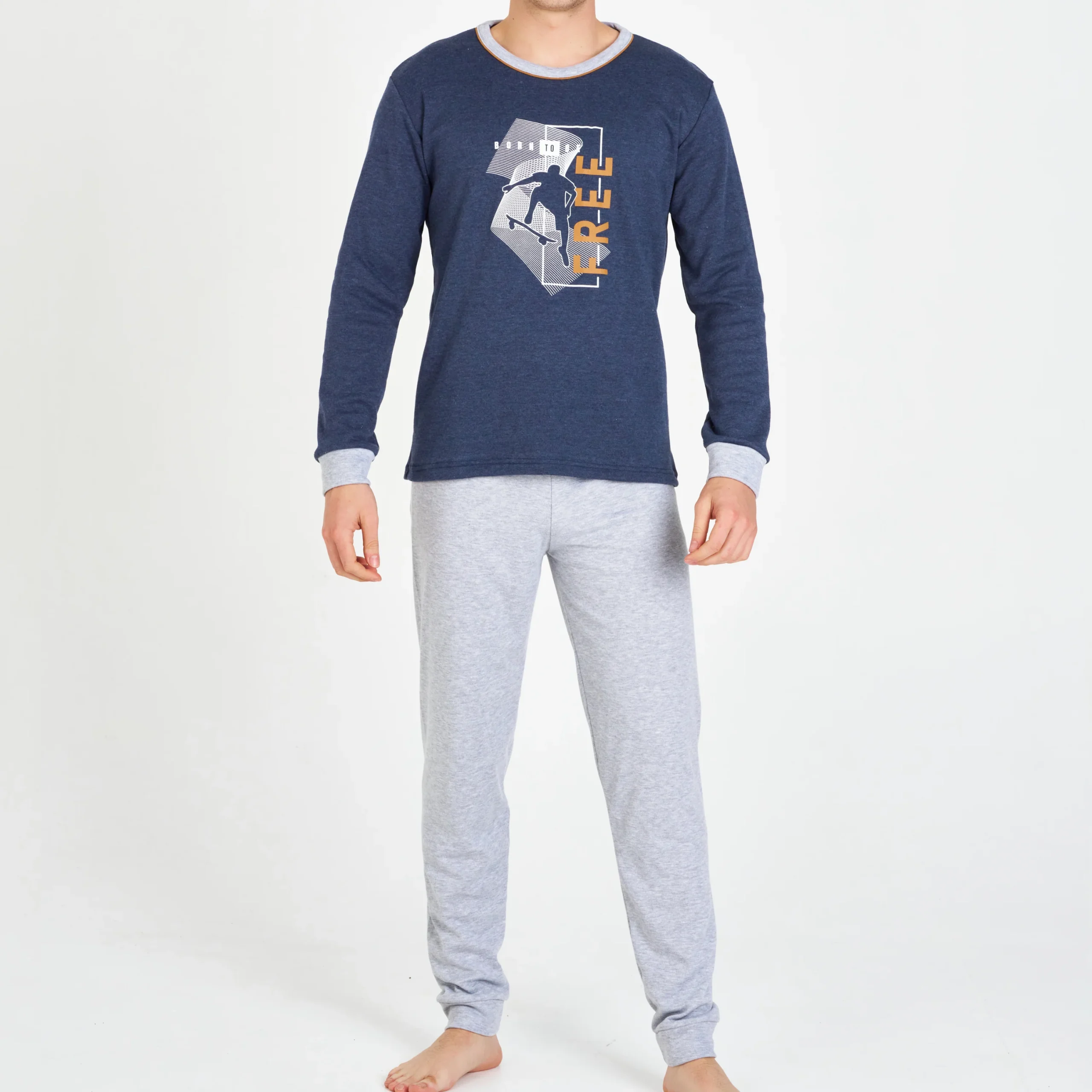 Pijama de invierno con camiseta azul marino y estampado gráfico “Free”. Cuello redondo con vivo contrastado y puños gris vigoré. Pantalón largo gris de tacto suave con cintura elástica y bajo recto. Confort térmico y ajuste regular pensado para dormir abrigado sin perder libertad de movimiento.