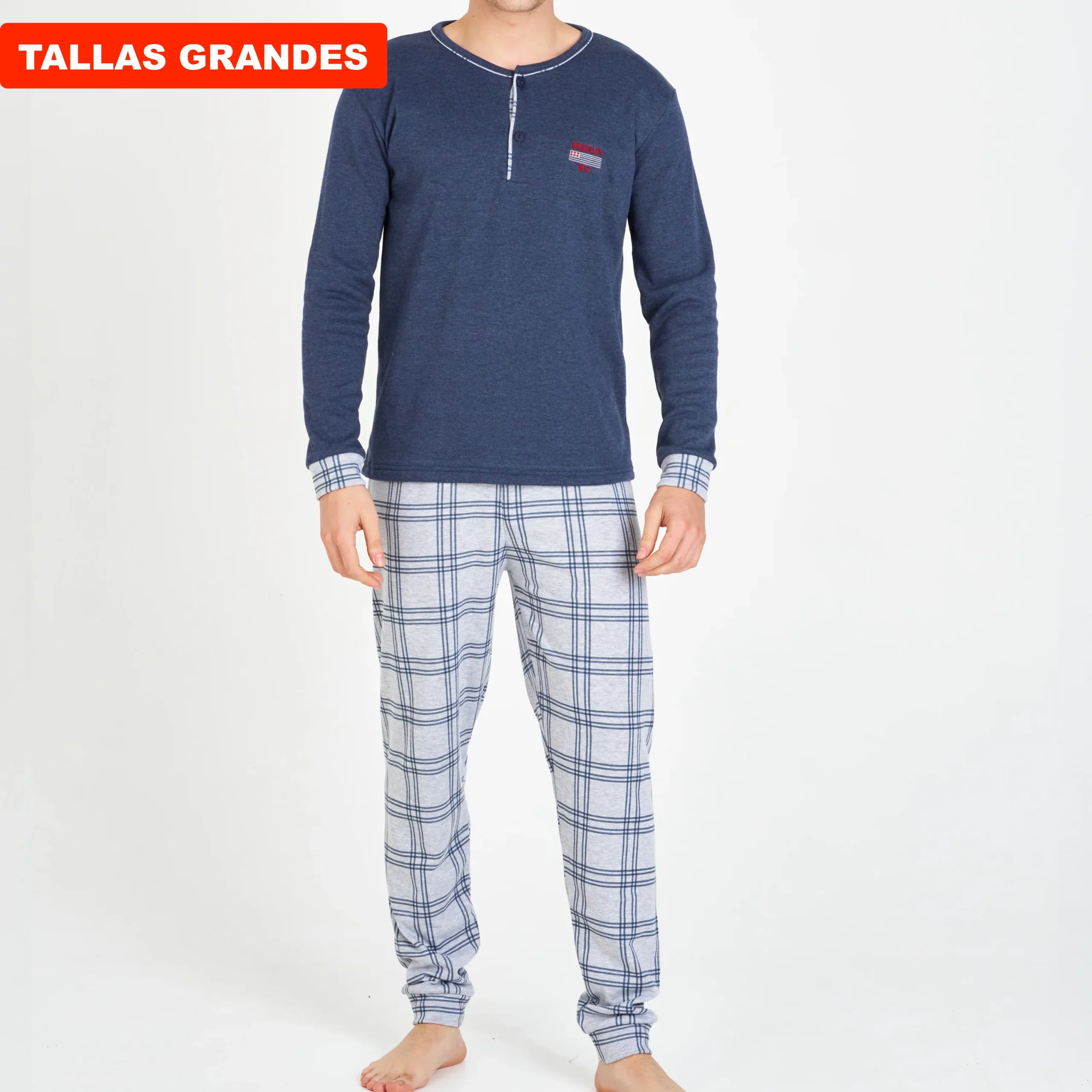 Pijama de invierno para tallas grandes con patronaje ampliado en torso y abdomen. Camiseta marino con apertura frontal fácil de vestir y acabados a contraste. Pantalón de cuadros con cintura elástica ancha y tiro confortable que evita presiones al sentarse. Tejido agradable que abriga sin perder libertad de movimiento.